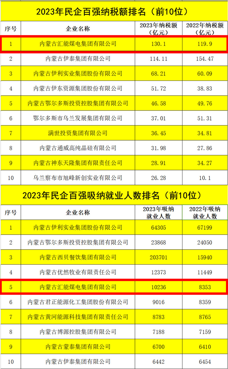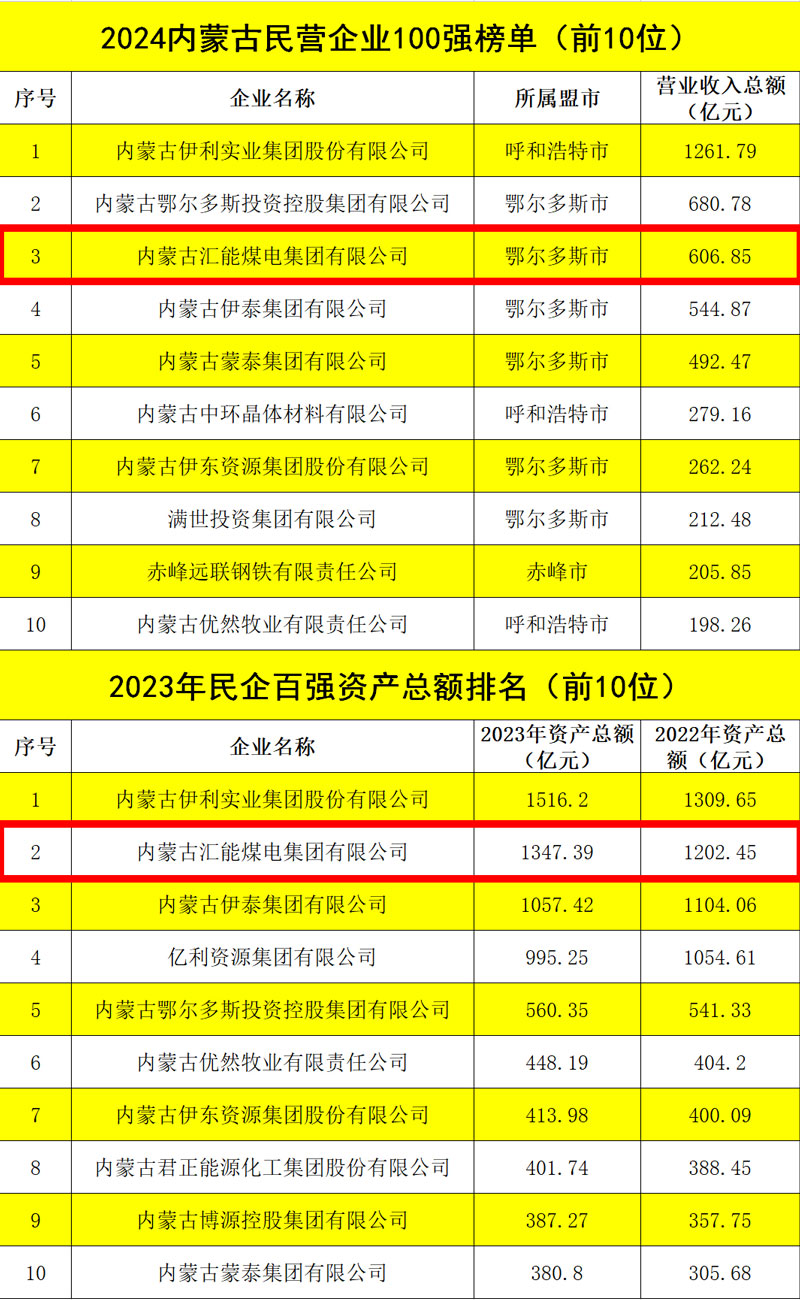 6月25日,2024內(nèi)蒙古民營(yíng)企業(yè)100強(qiáng)發(fā)布會(huì)暨內(nèi)蒙古自治區(qū)促進(jìn)“兩個(gè)健康”現(xiàn)場(chǎng)會(huì)在內(nèi)蒙古鄂爾多斯市舉行。會(huì)上公布了2024內(nèi)蒙古民營(yíng)企業(yè)100強(qiáng)系列榜單,匯能集團(tuán)以606.85億元營(yíng)收總額榮列百?gòu)?qiáng)榜單第三位,較上年增長(zhǎng)110.41億元,上升一位;資產(chǎn)總額1347.39億元,較去年增長(zhǎng)144.94億元,仍位列民企百?gòu)?qiáng)第二位;納稅額130.1億元,位列民企百?gòu)?qiáng)第一位,較上年增長(zhǎng)10.2億元,上升一位;吸納就業(yè)人數(shù)10236人,位列民企百?gòu)?qiáng)第五位,較上年增加1883人,上升兩位。